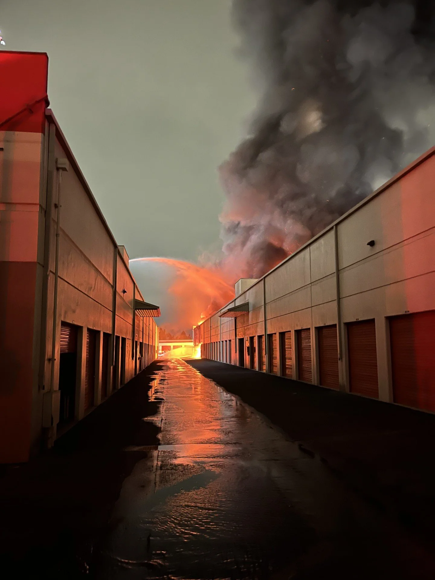 Firefighters work aggressively to contain a structure fire in a storage facility in the early morning.